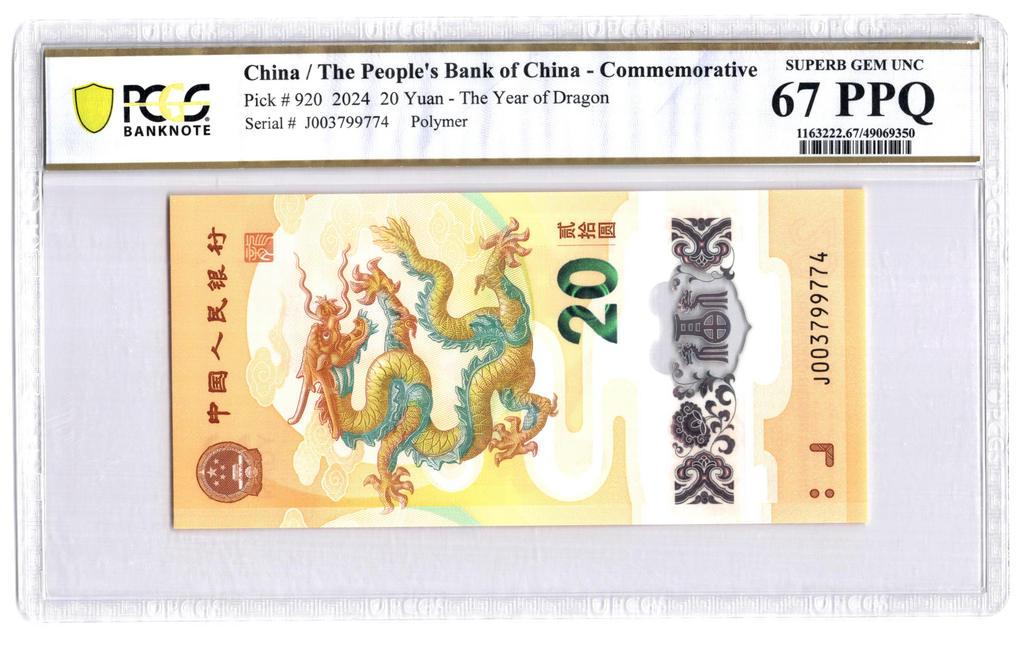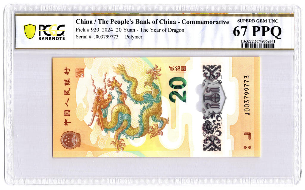 PCGS 67PPQ Graded China 20 Yuan 2024 P#920 Polymer Banknote The Year Of Dragon Superb UNC